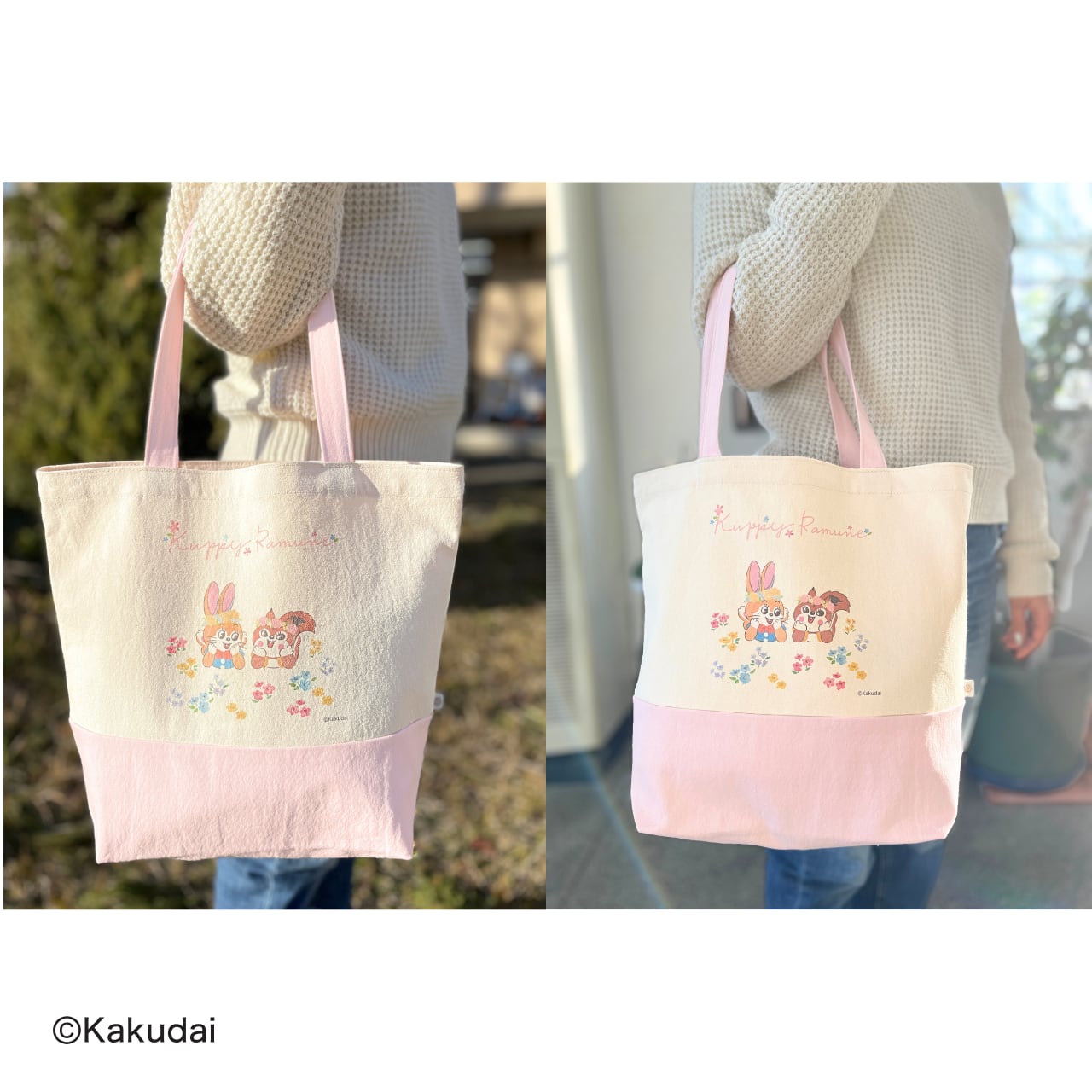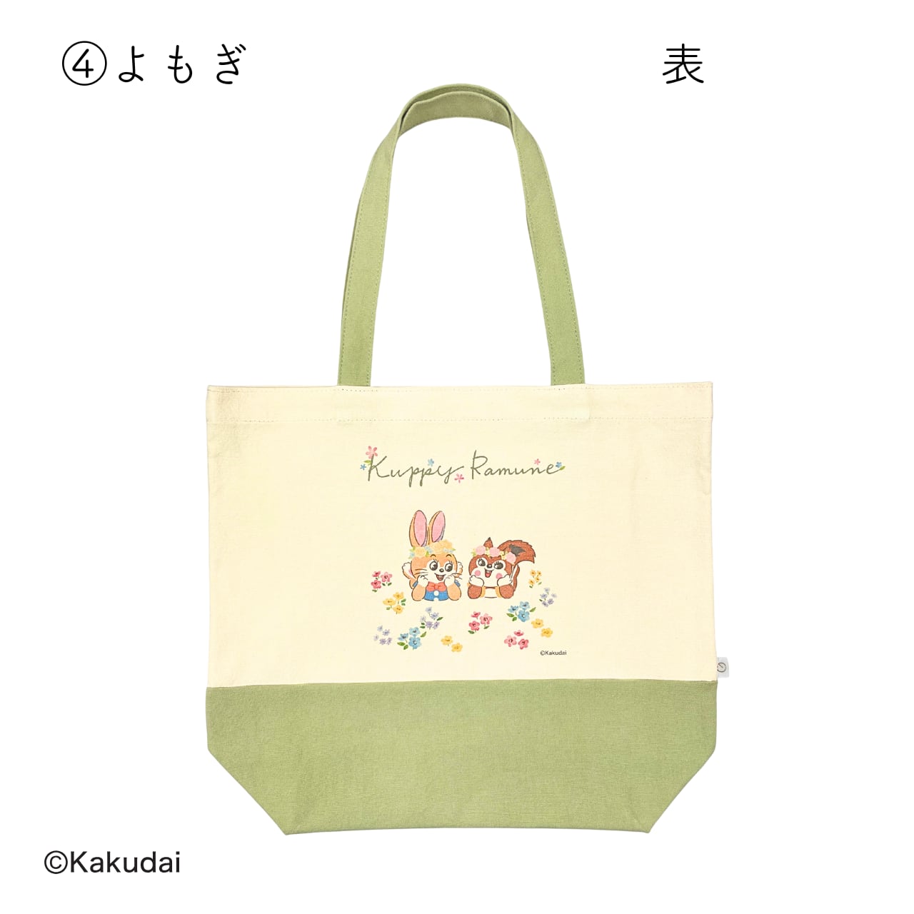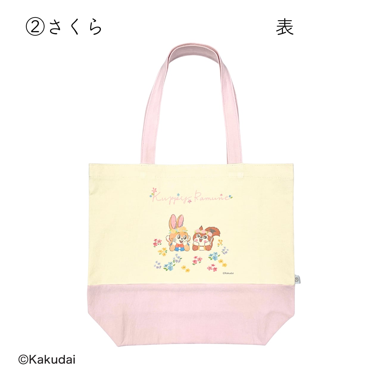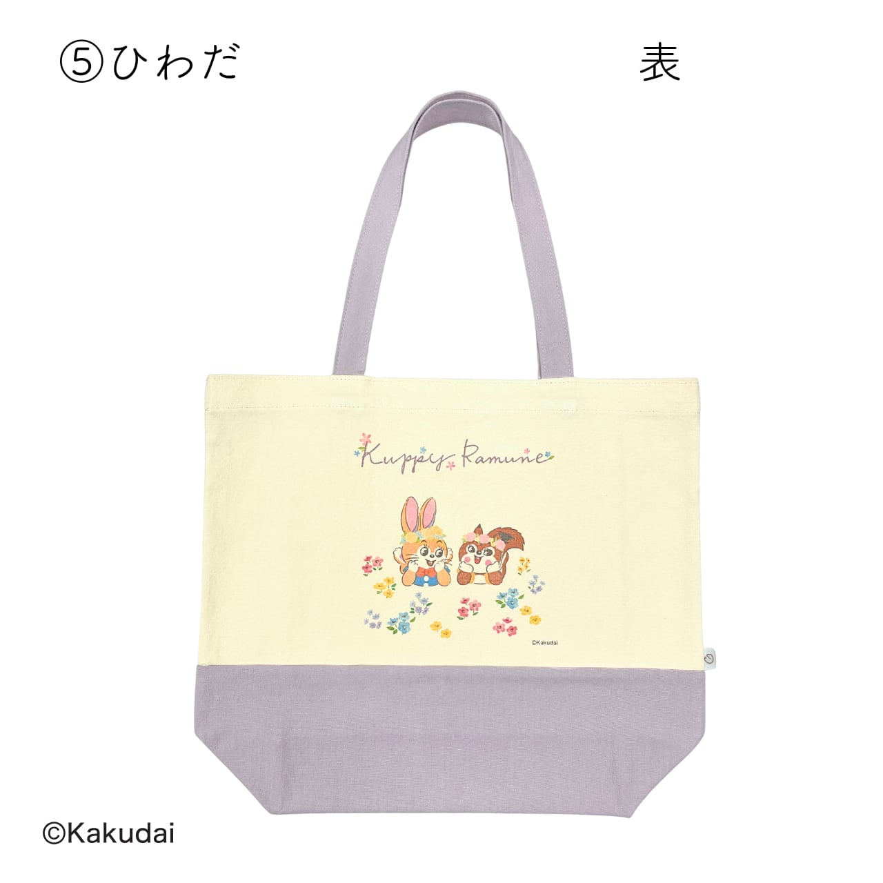 お花に囲まれたクッピーとラムがデザインされているトートバッグです。