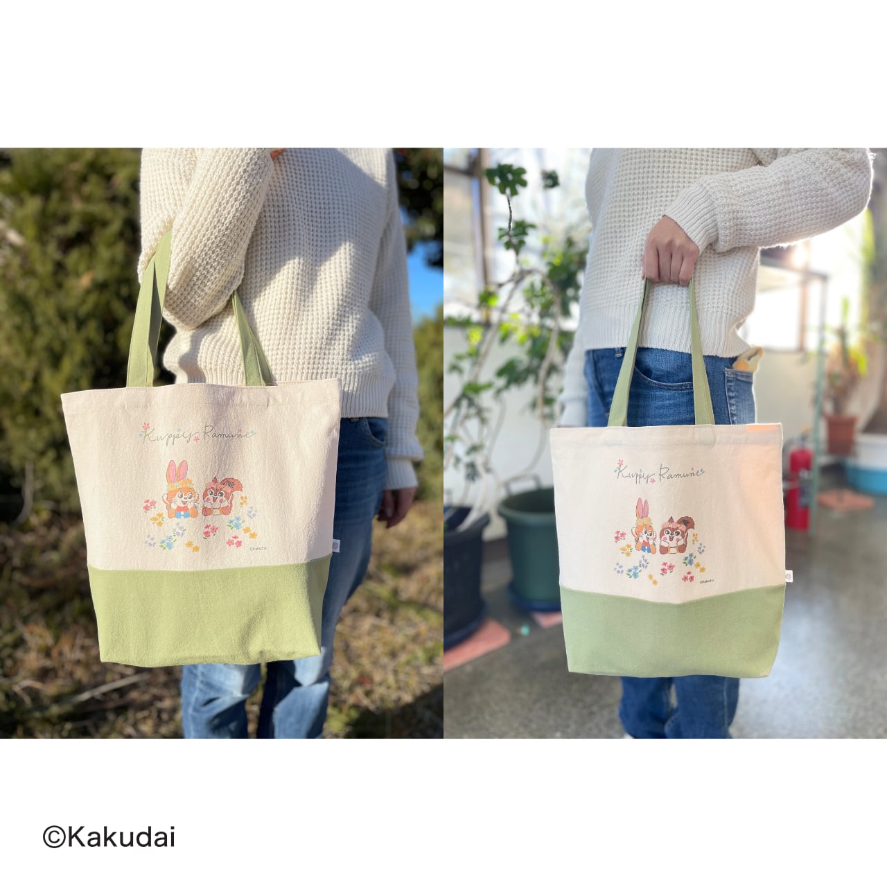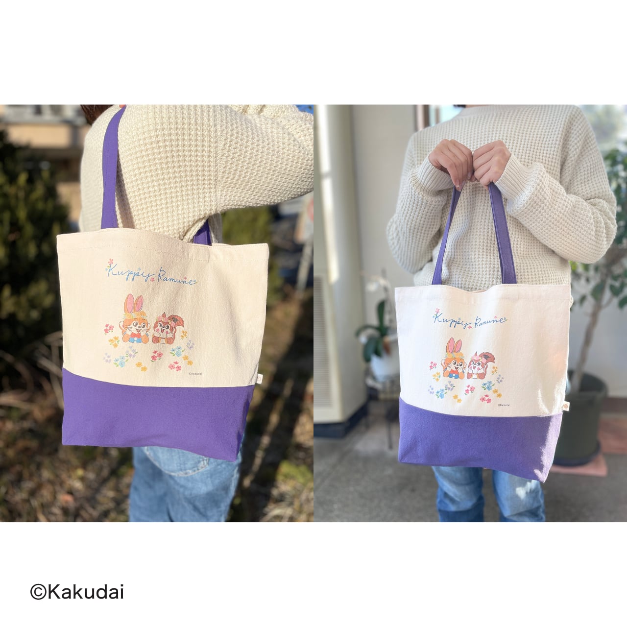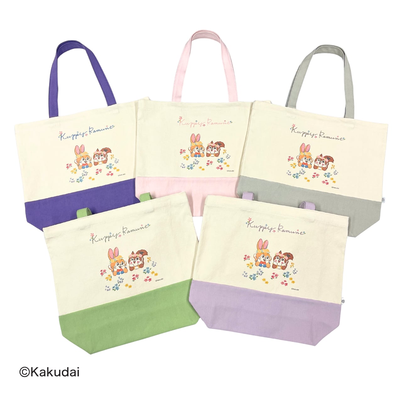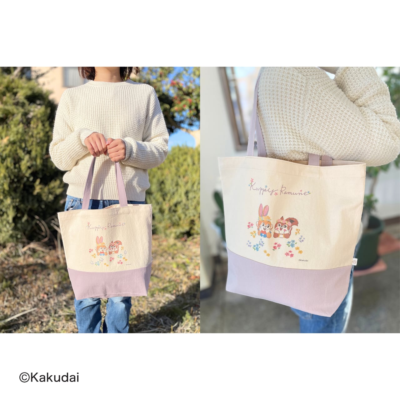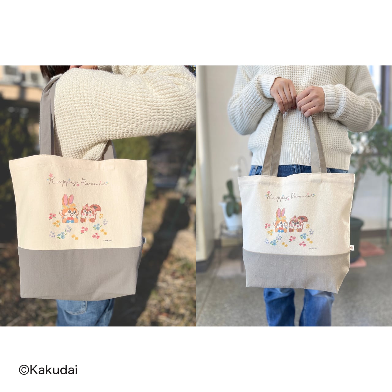 お花に囲まれたクッピーとラムがデザインされているトートバッグです。